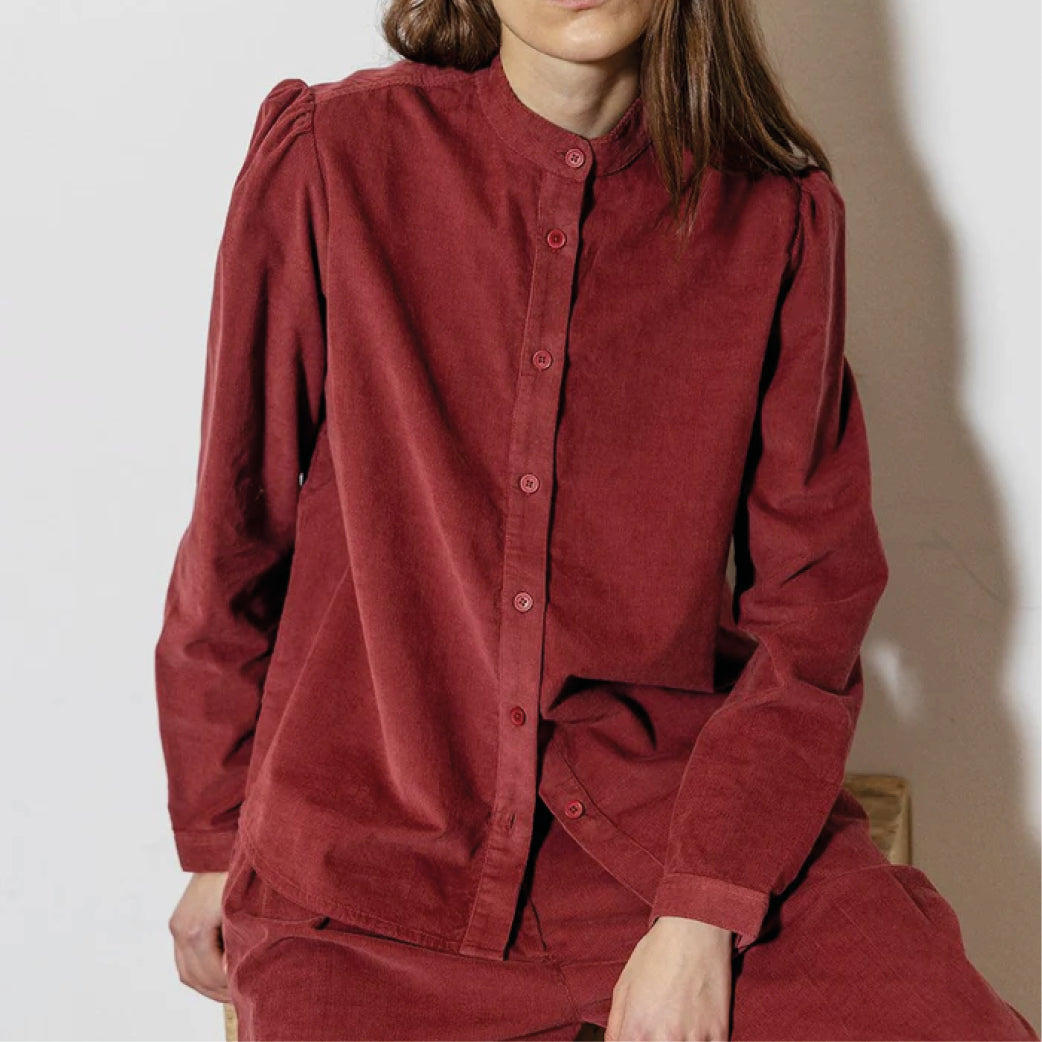 Cool fløjlsskjorte fra Project Aj117 med kinakrave og puf ved skuldrene.