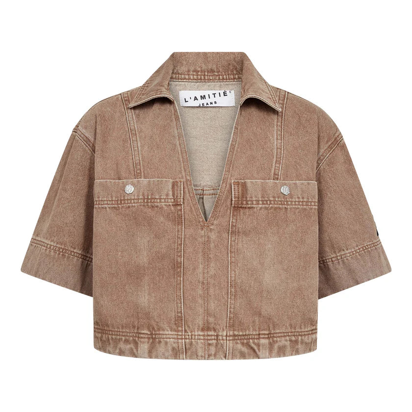 Cool kort camel bluse fra Haute L'amitie med v-udskæring og store brystlommer. Style med de matchende jeans.