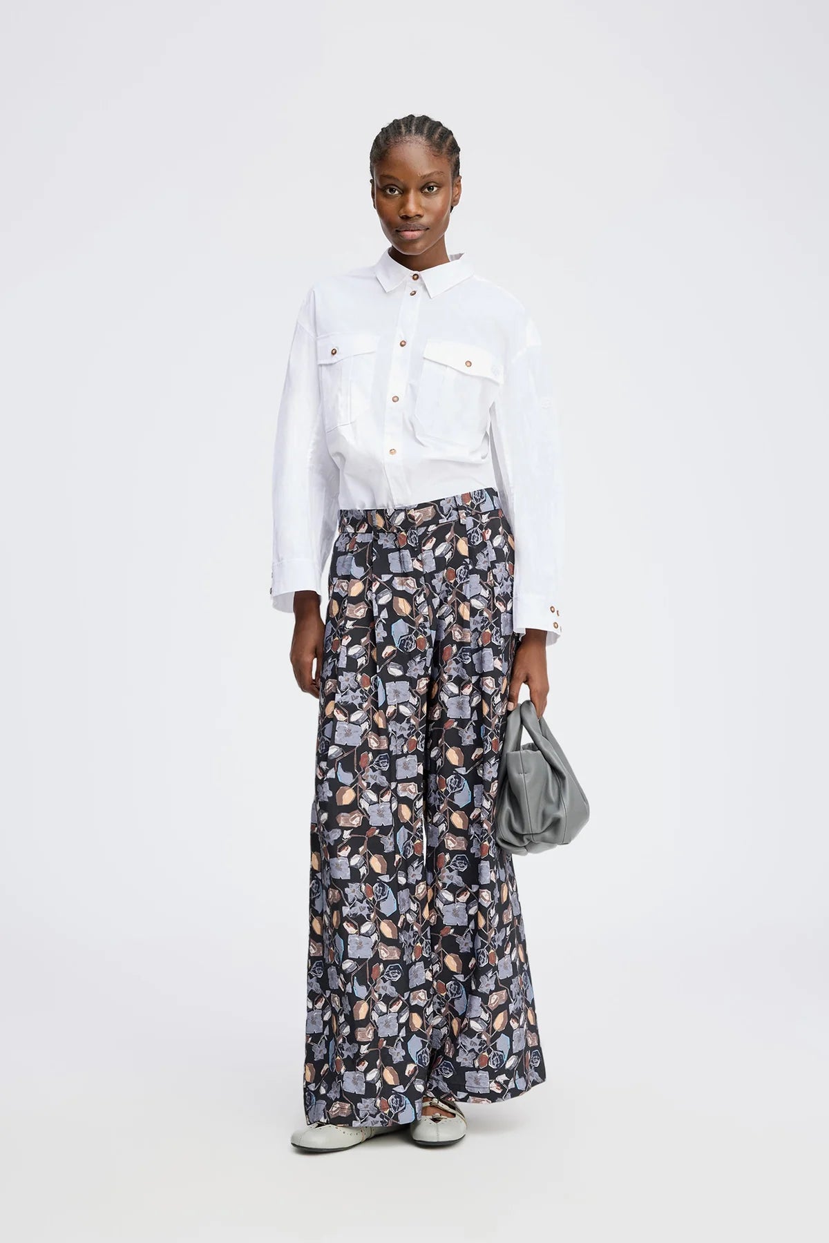 Flotte bukser med flot all-over print fra Munthe. Bukserne er designet med fine læg, bæltestropper, lommer og en enkelt knaplukning. Style med den matchende skjorte.