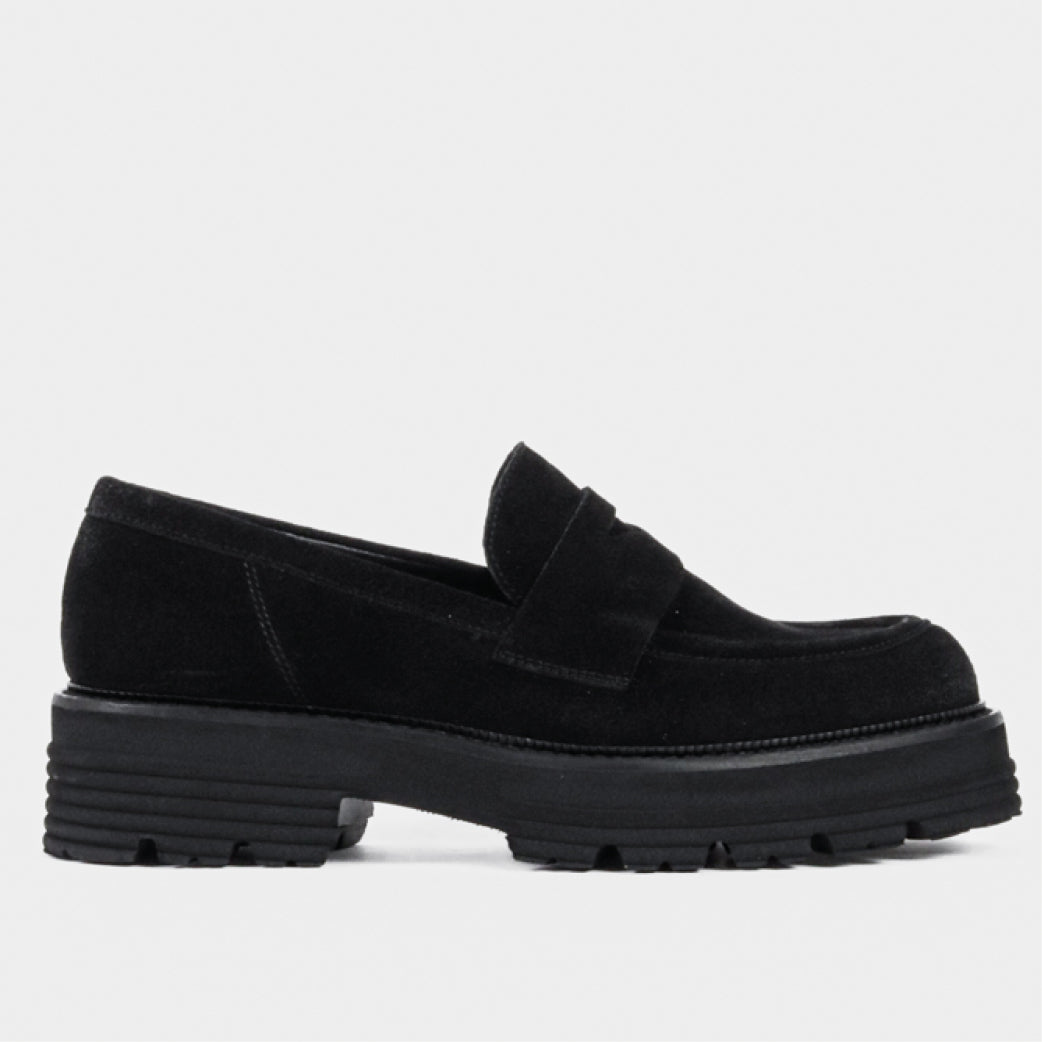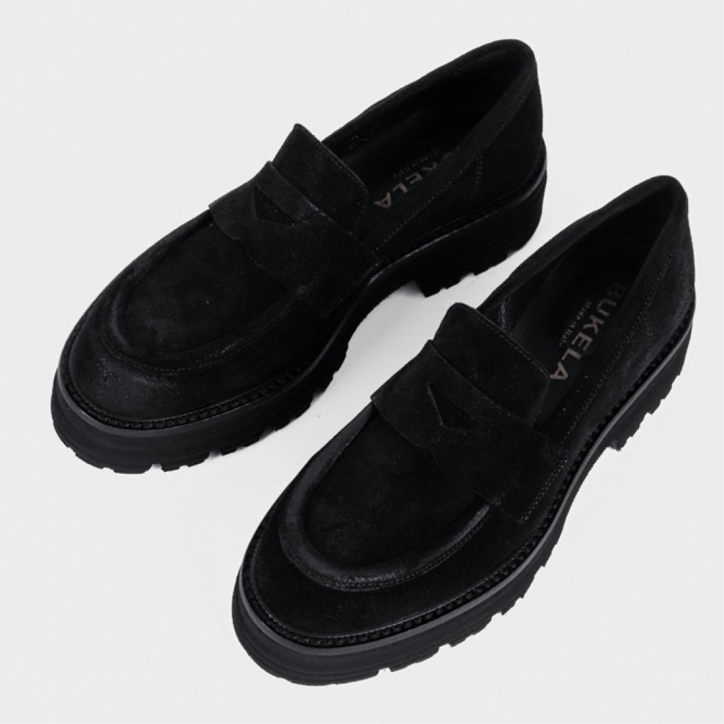 Flotte klassiske sorte loafers fra Bukela i ruskind med fine detaljer. Med lille hæl og behagelig pasform. Et must til sæsonens styles.