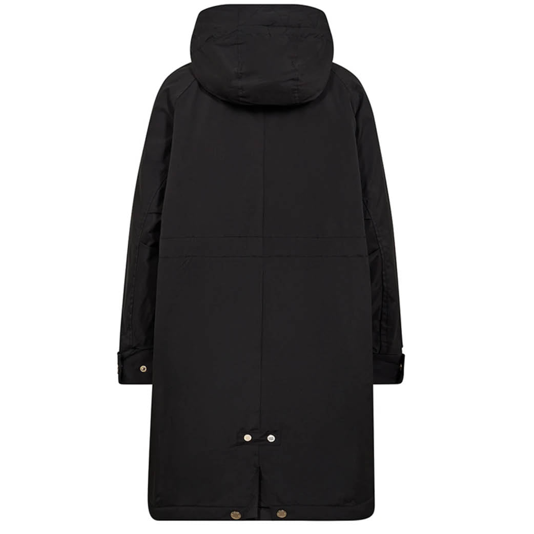 Skøn parka jakke fra Mos Mosh med hætte og skjult lynlåslukning. Med store praktiske lommer og fin slids bagpå.