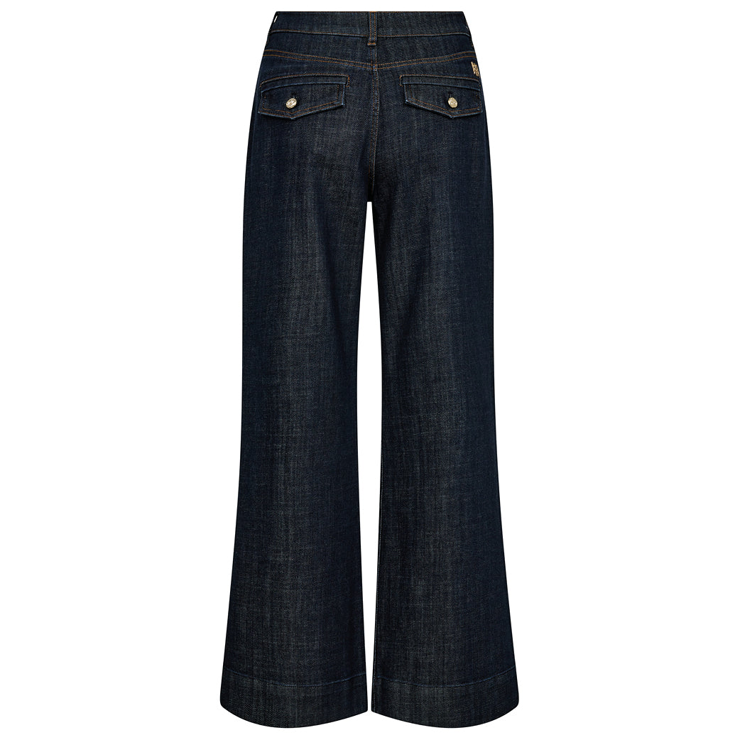 Flotte mørke jeans fra Mos Mosh designet i en wide-leg-pasform med høj talje og et let stræk, som gør dem behagelige at have på. Med cool klaplommer med knap bagpå.