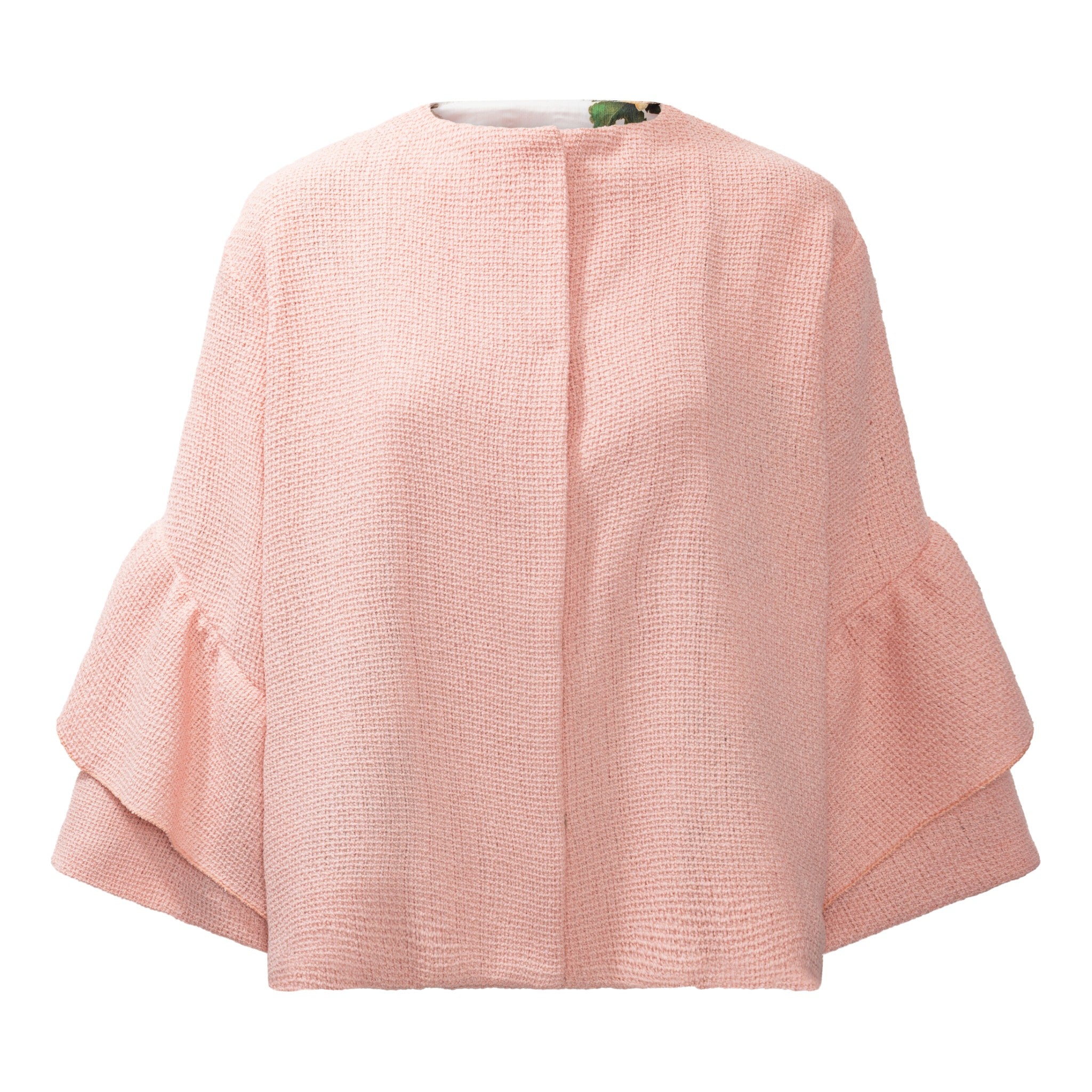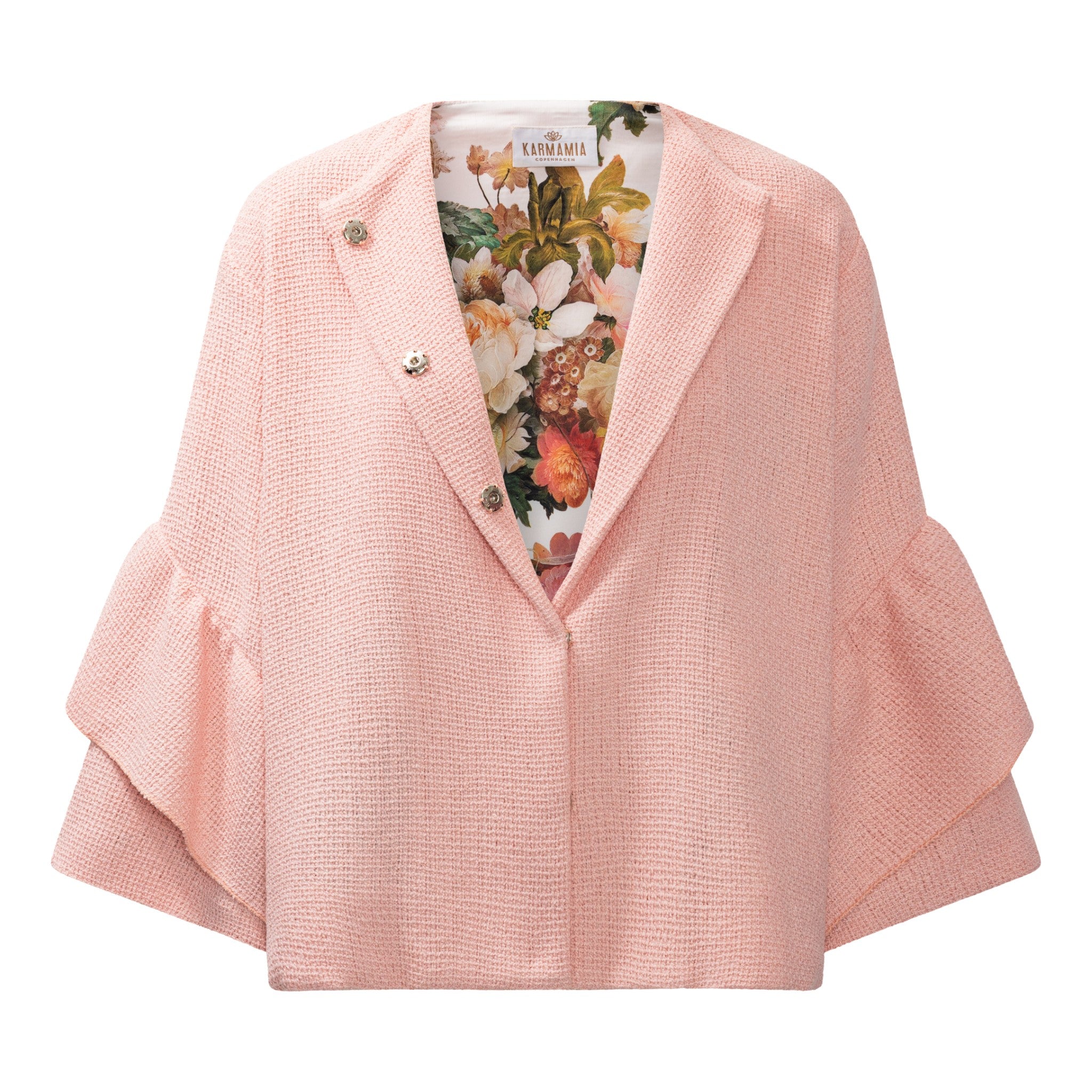 Elegant populær kort jakke fra Karmamia med peplum ærmer og knapluking. Med smukt satinfoer. Limited edition. One Size.