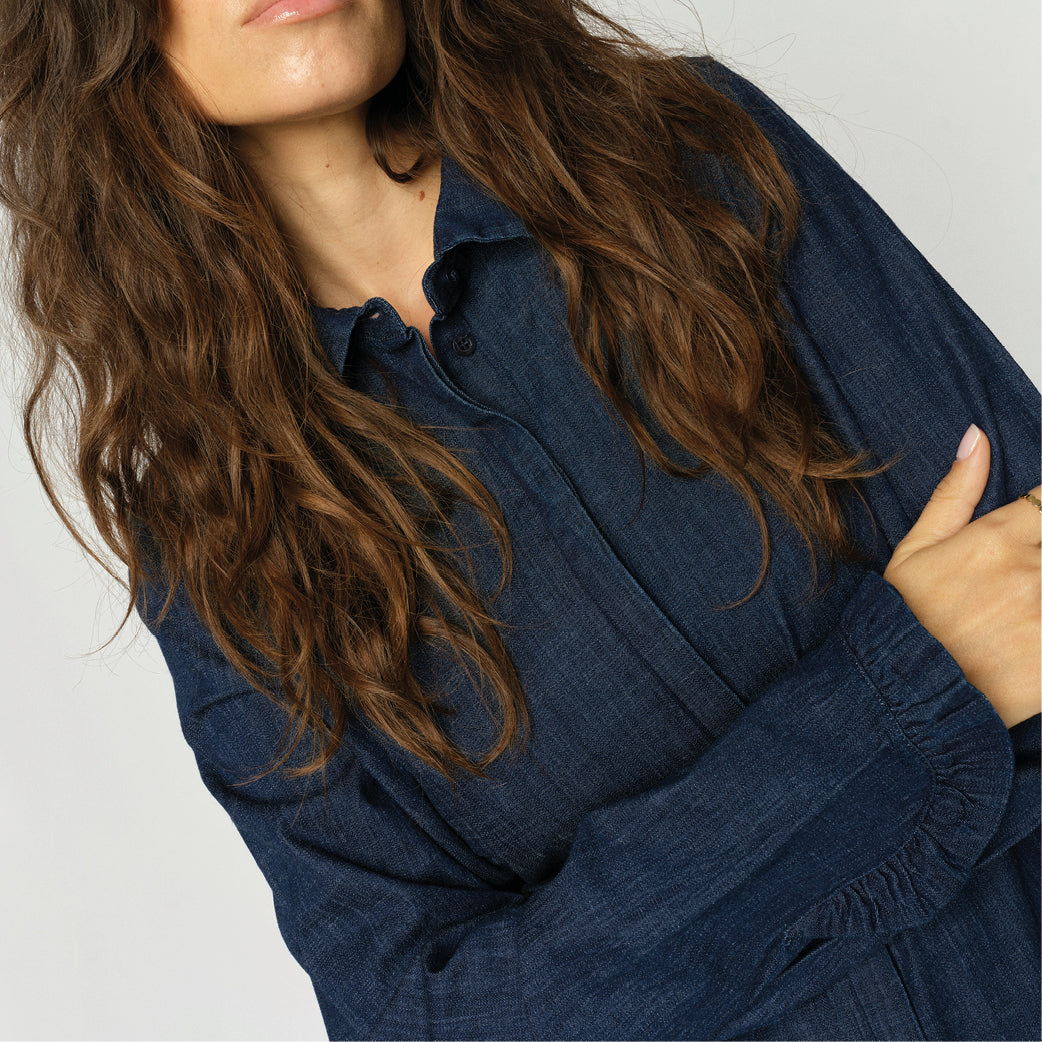 Skøn mørkeblå denimkjole fra Mos Mosh med knaplukning og fine flæsedetaljer ved ærmerne.