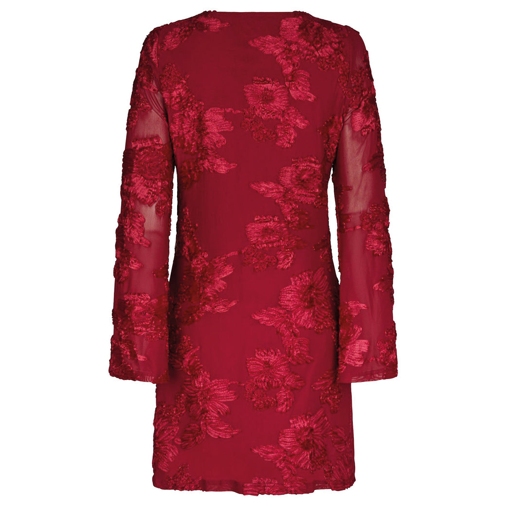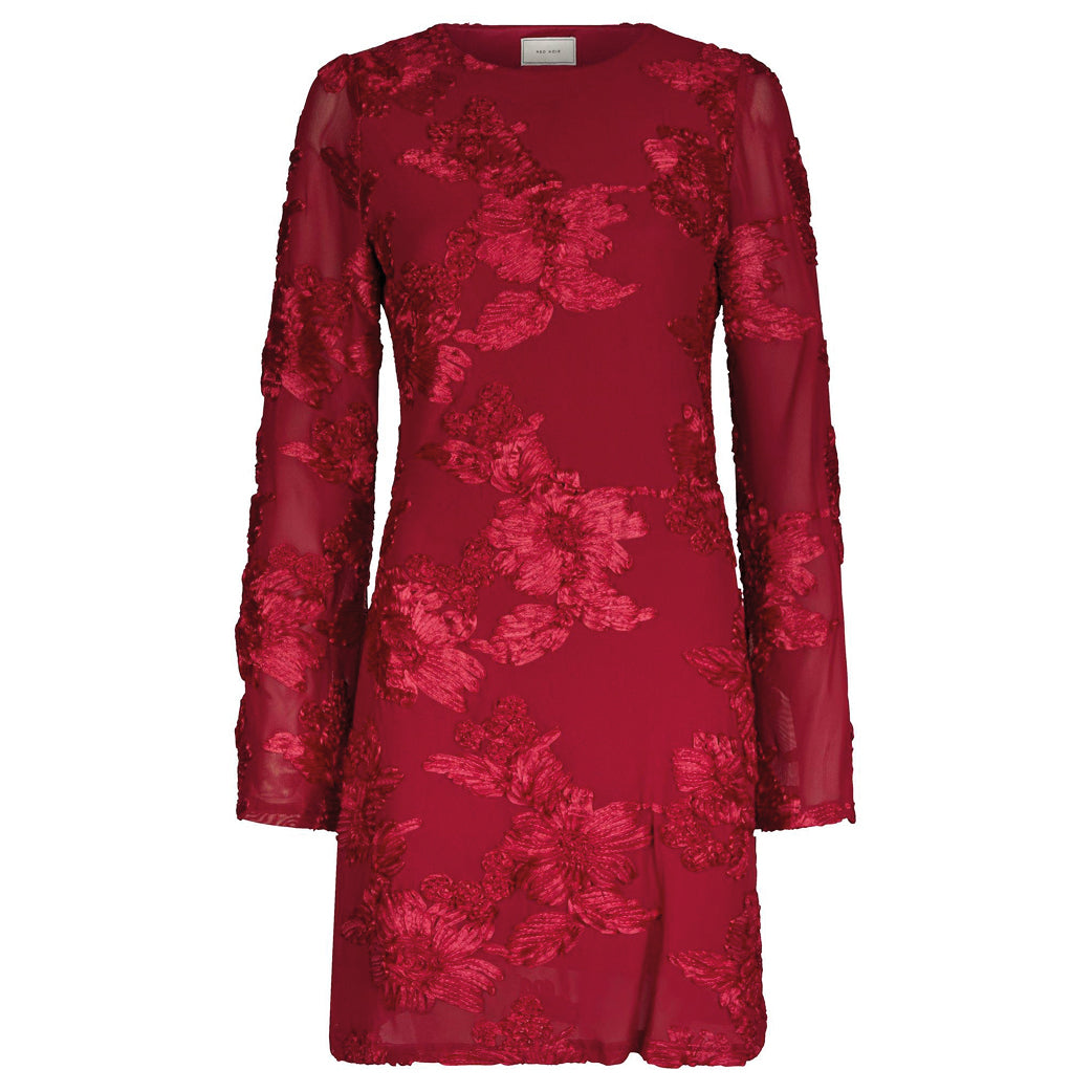 Smuk og elegant rød kjole fra Neo Noir med fine påsyede blomster og lange ærmer.