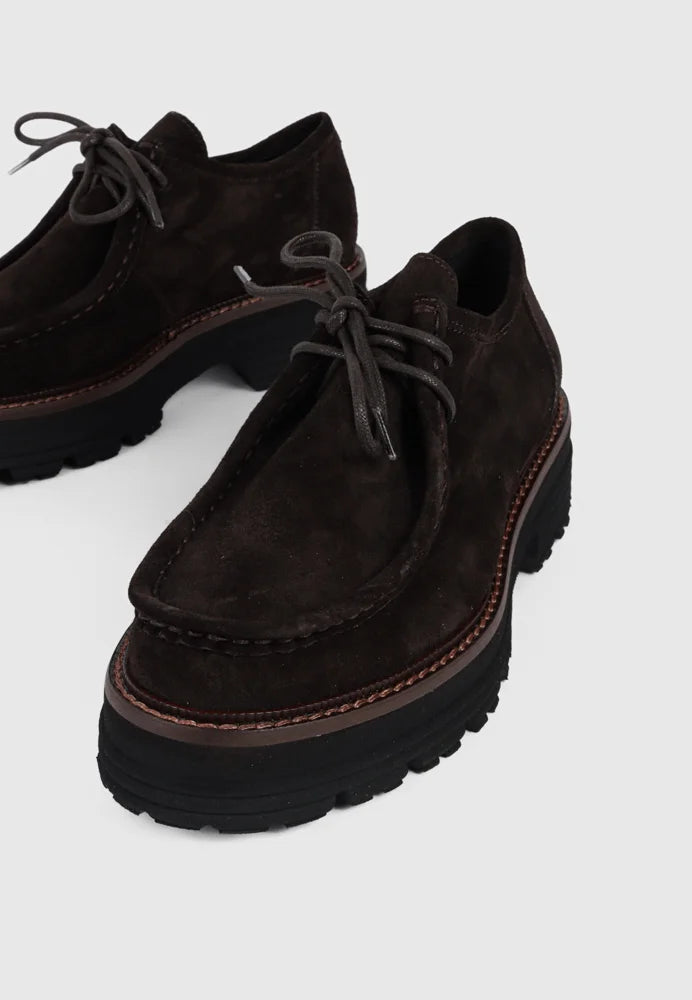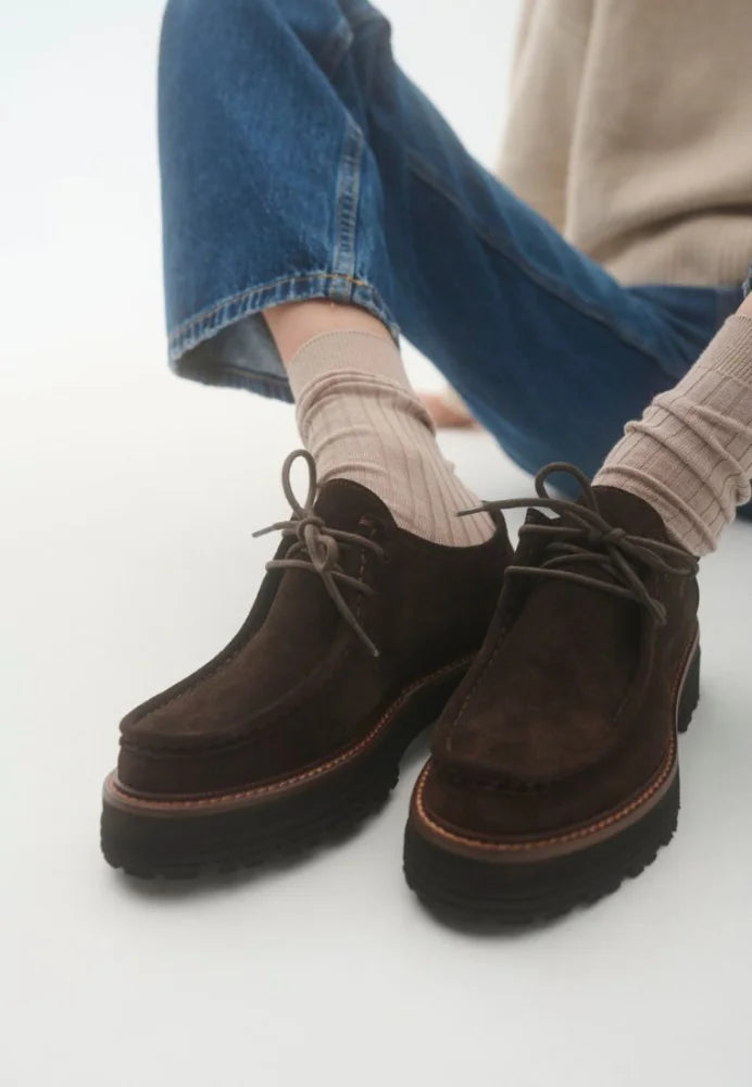 Flotte mørkebrune sko fra Bukela i ruskind med fine detaljer. Med lille hæl og behagelig pasform. Et must til sæsonens styles.