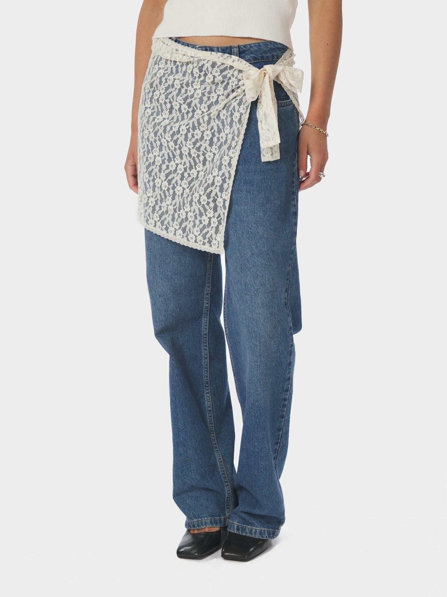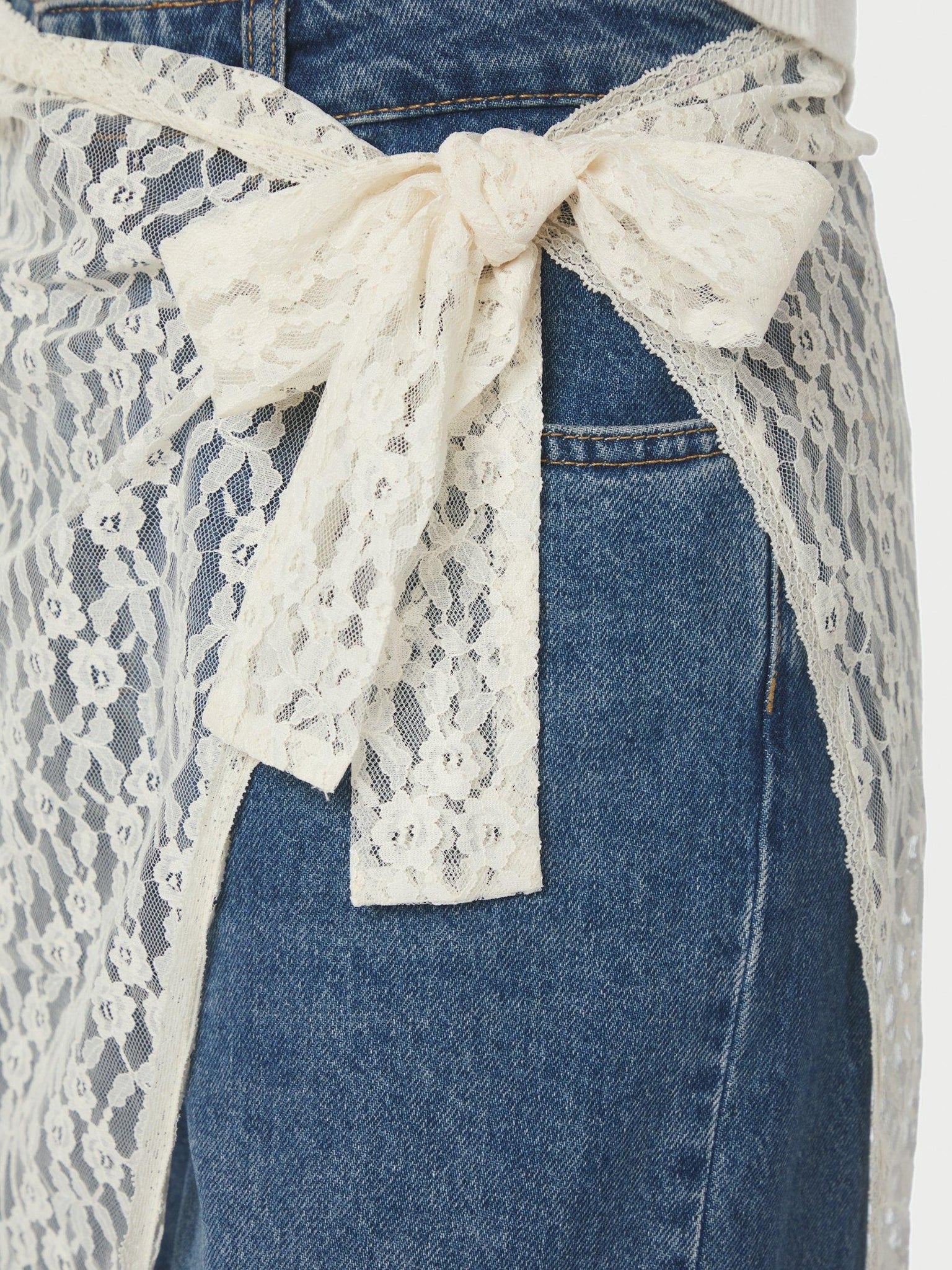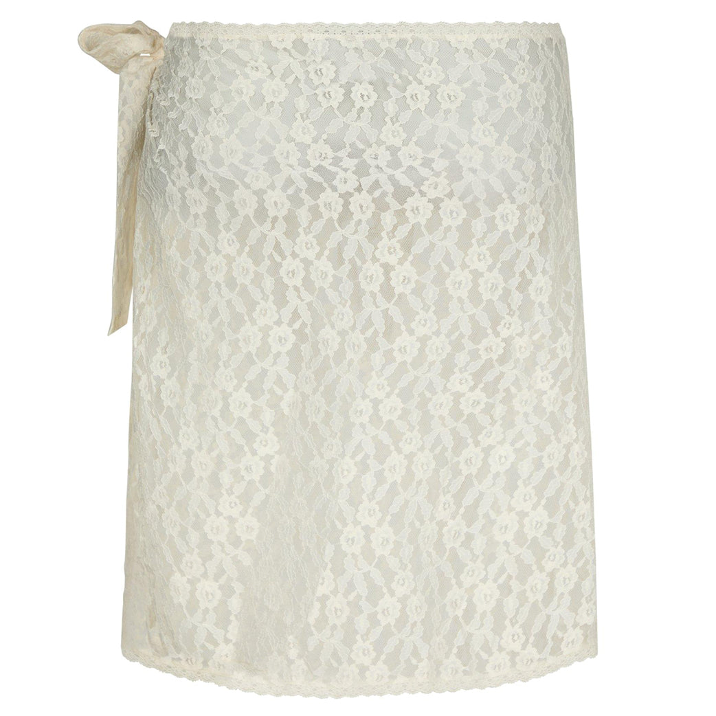 Smuk gennemsigtig blondenederdel fra Neo Noir med bindebånd i siden. Modellen er iklædt en str. 36.