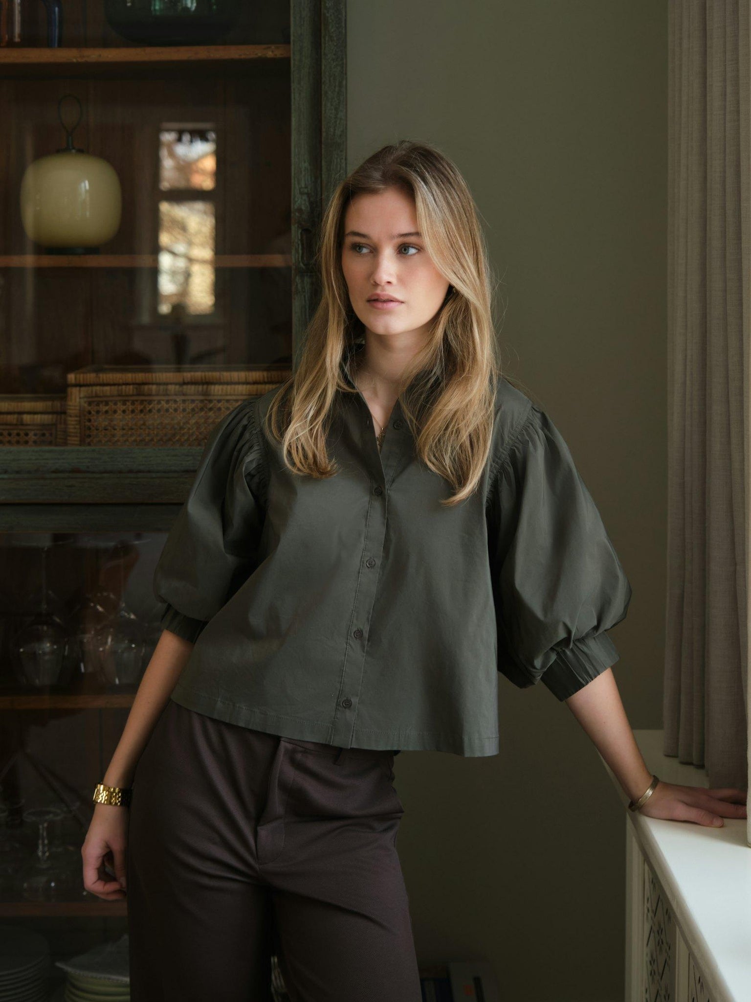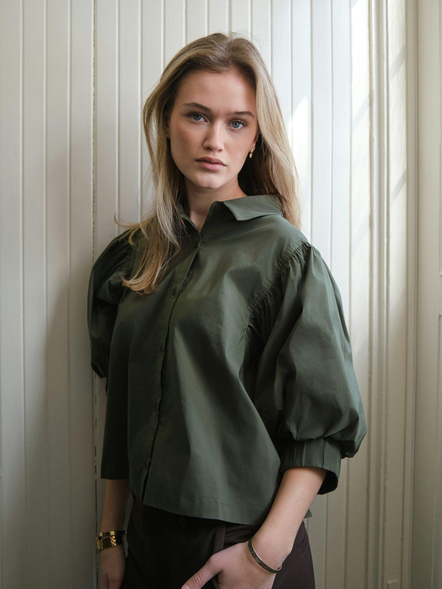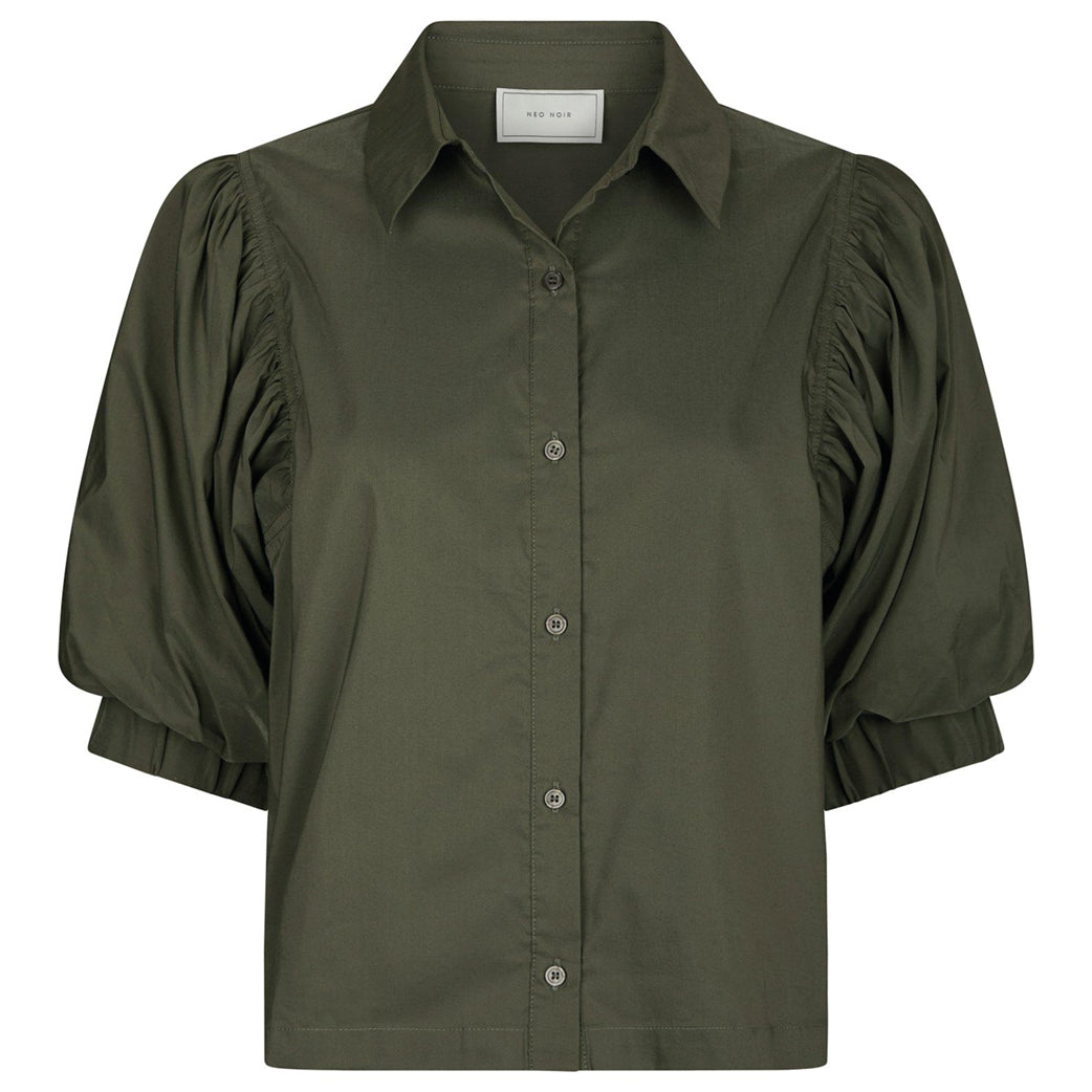 Flot mørkegrøn skjorte i poplinkvalitet fra Neo Noir med 3/4 ærmer med puf.