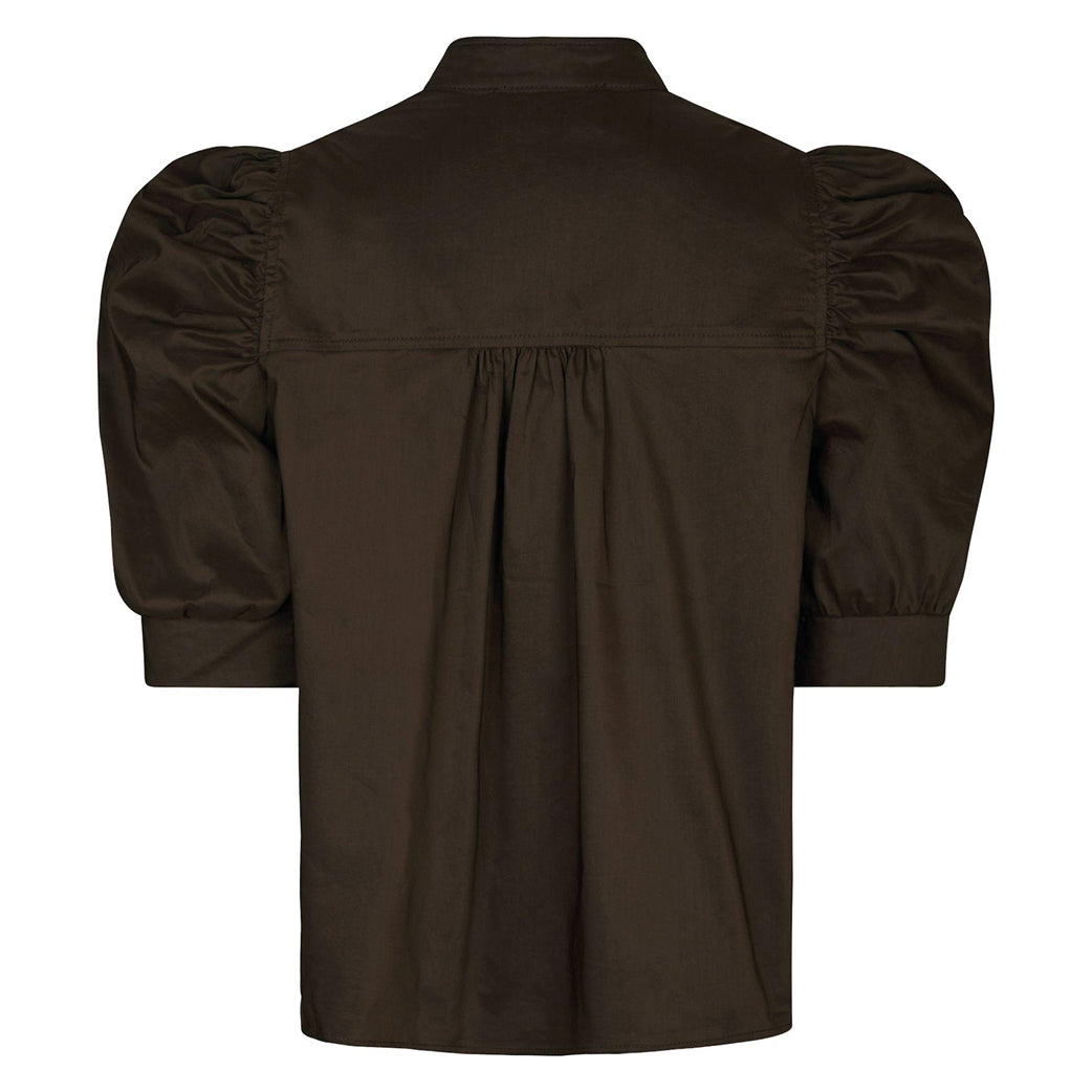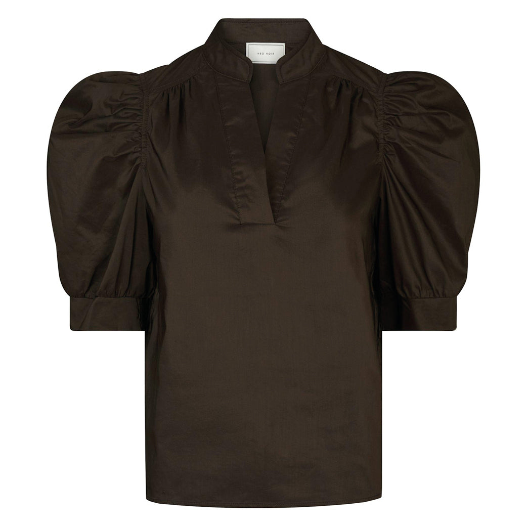 Flot mørkebrun bluse i poplinkvalitet fra Neo Noir med 3/4 ærmer med puf, v-udskæring og fin detalje på ryggen.