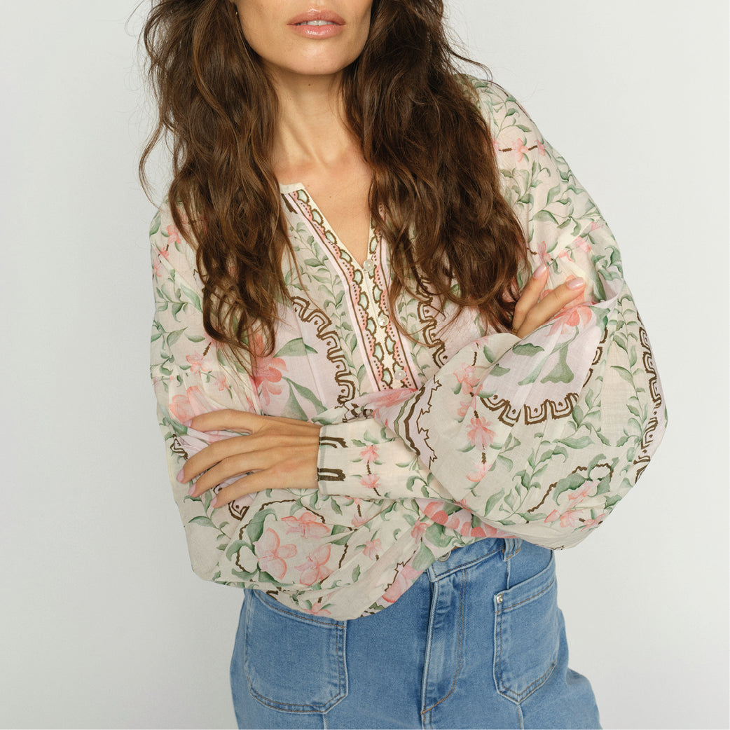Skøn boheme-bluse fra Mos Mosh med lille udskæring og lange ærmer.