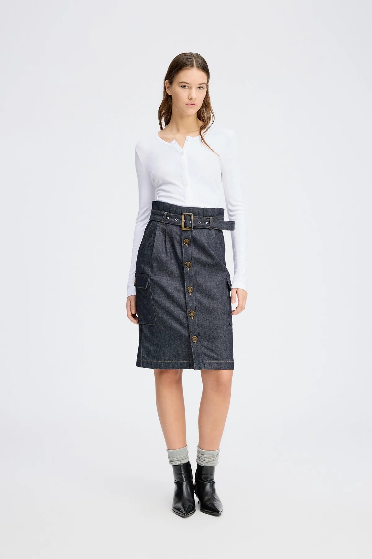Cool højtaljet denimnederdel fra Munthe med knaplukning, aftageligt bælte og lommer i siderne.