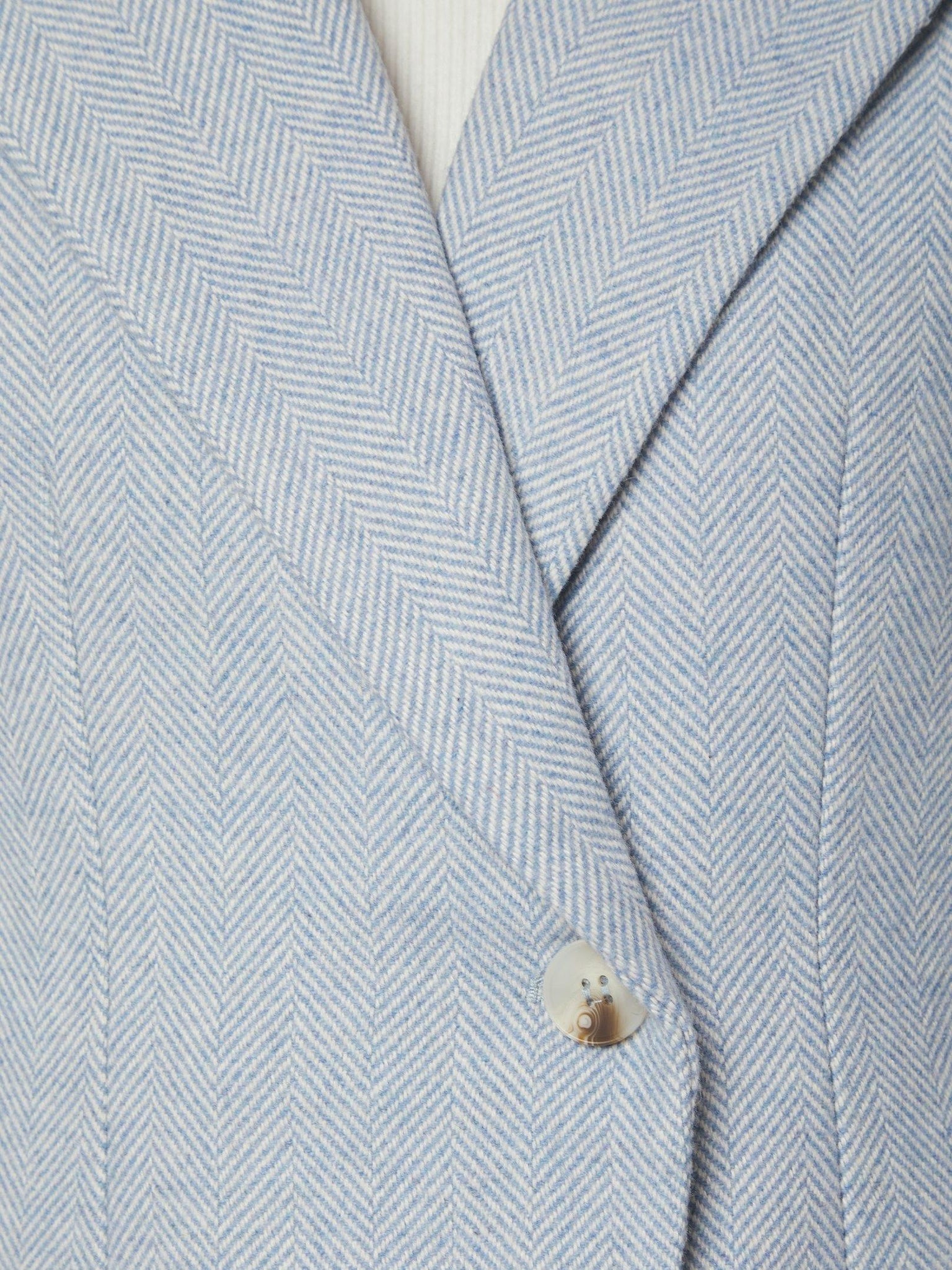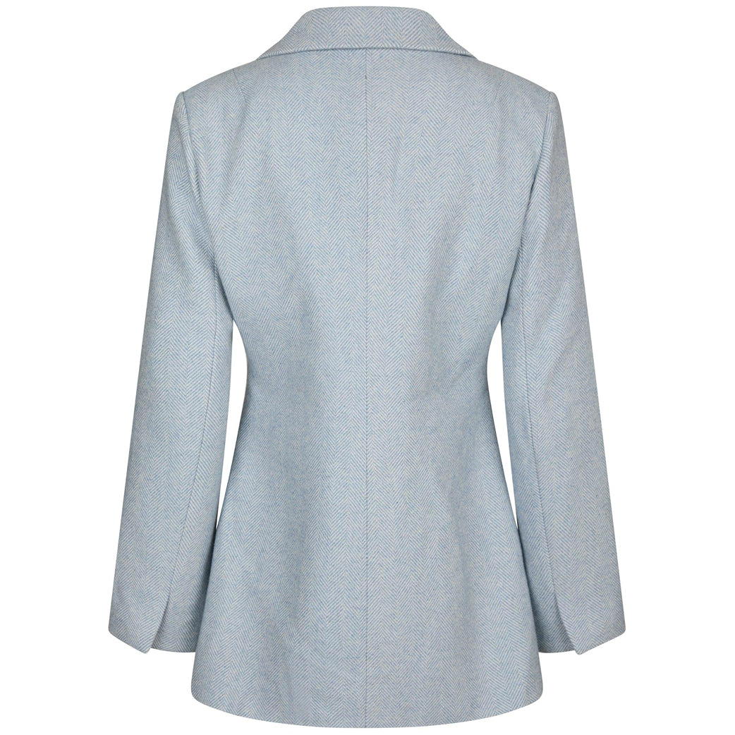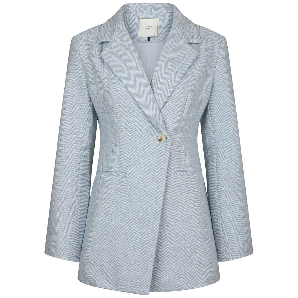 Flot og elegant lyseblå blazer fra Neo Noir med enkelt assymetrisk knaplukning. Lavet i en fin herringbone kvalitet. Modellen er iklædt en str. 36.
