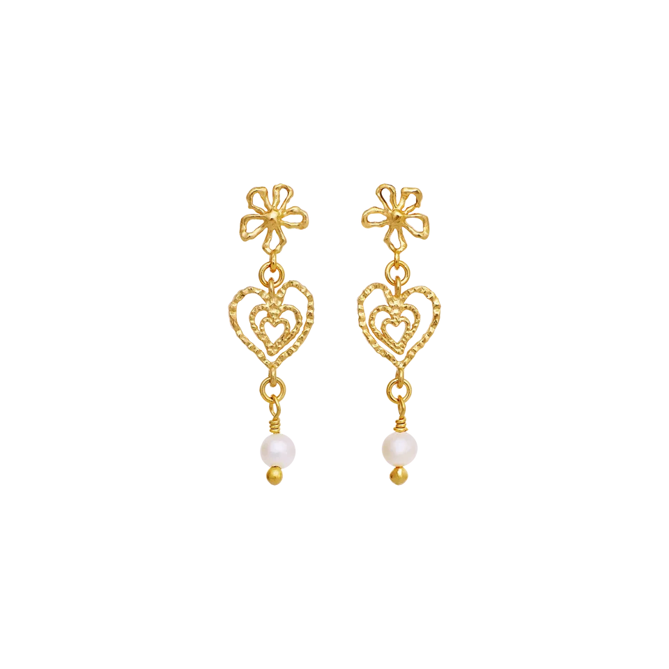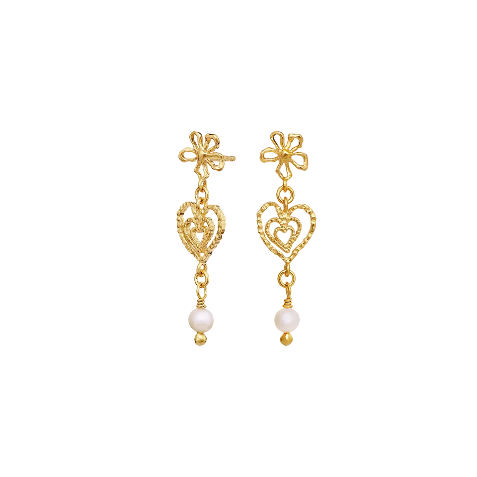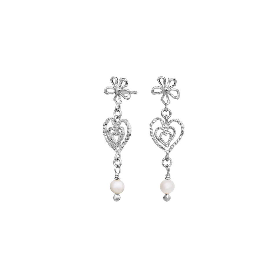 Smukke øreringe med hjertevedhæng og små ferskvandsperler fra Maanesten. Fås både i guld og sølv.