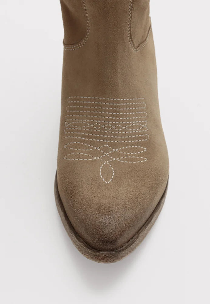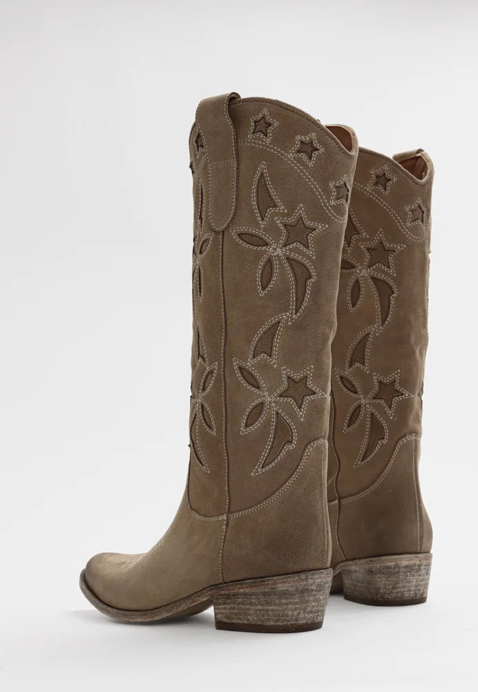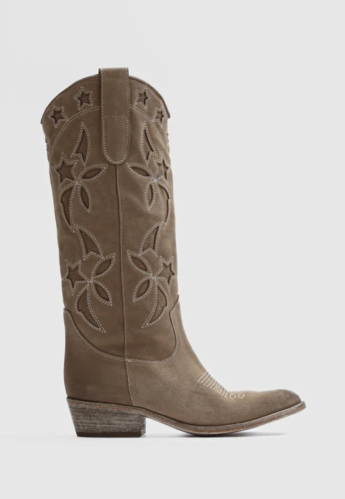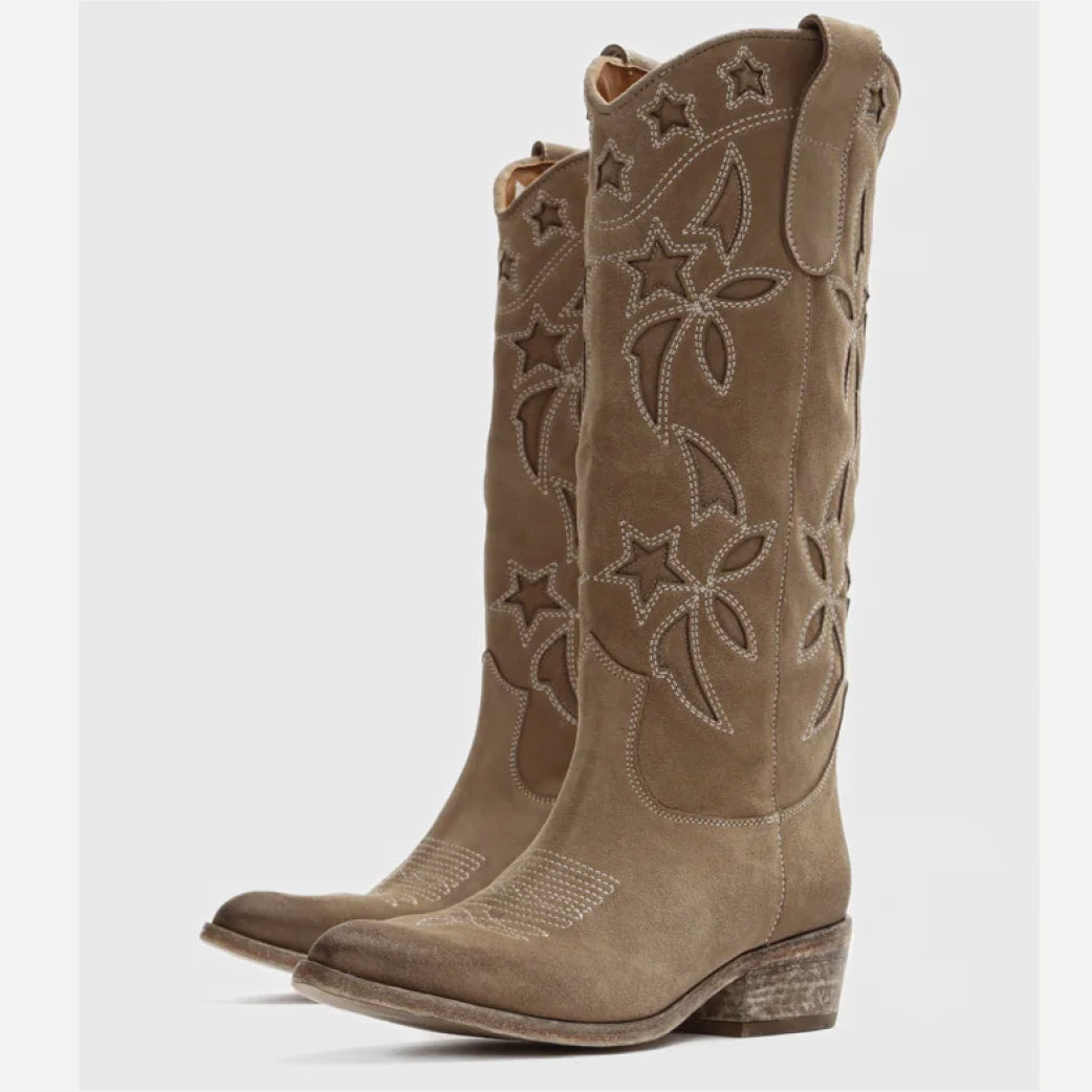 Lange flotte støvler fra Bukela med fine detaljer. Lavet i 100 % italiensk skind med broderi. Høj støvle med spids snude. Kan bådes styles til jeans/bukser og kjoler.