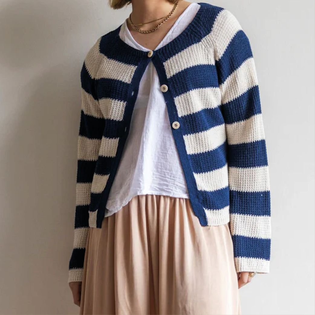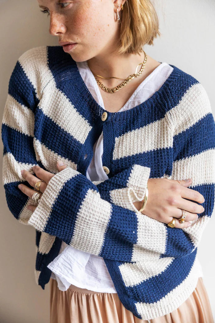 Fin stribet cardigan fra Project Aj117 lavet i let bomuldskvalitet. Lukkes med knapper. Modellen er iklædt en str. M.