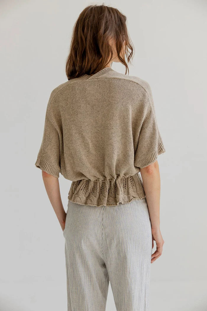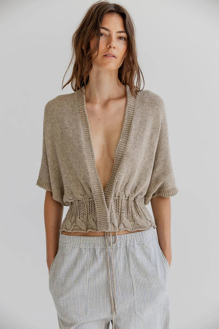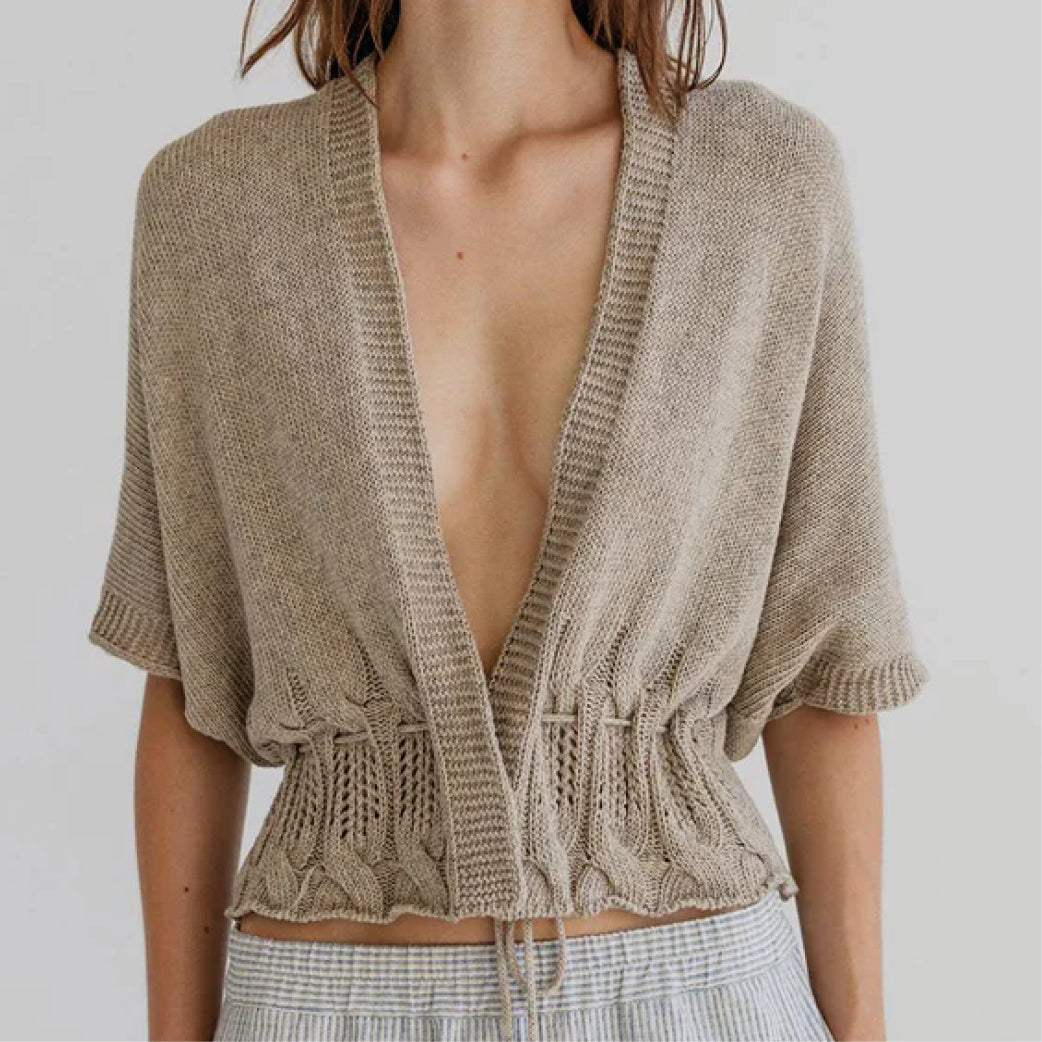 Elegant og feminin kort strikket cardigan fra Project Aj117 med v-udskæring og bindebånd i taljen.