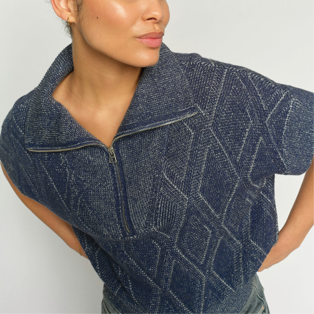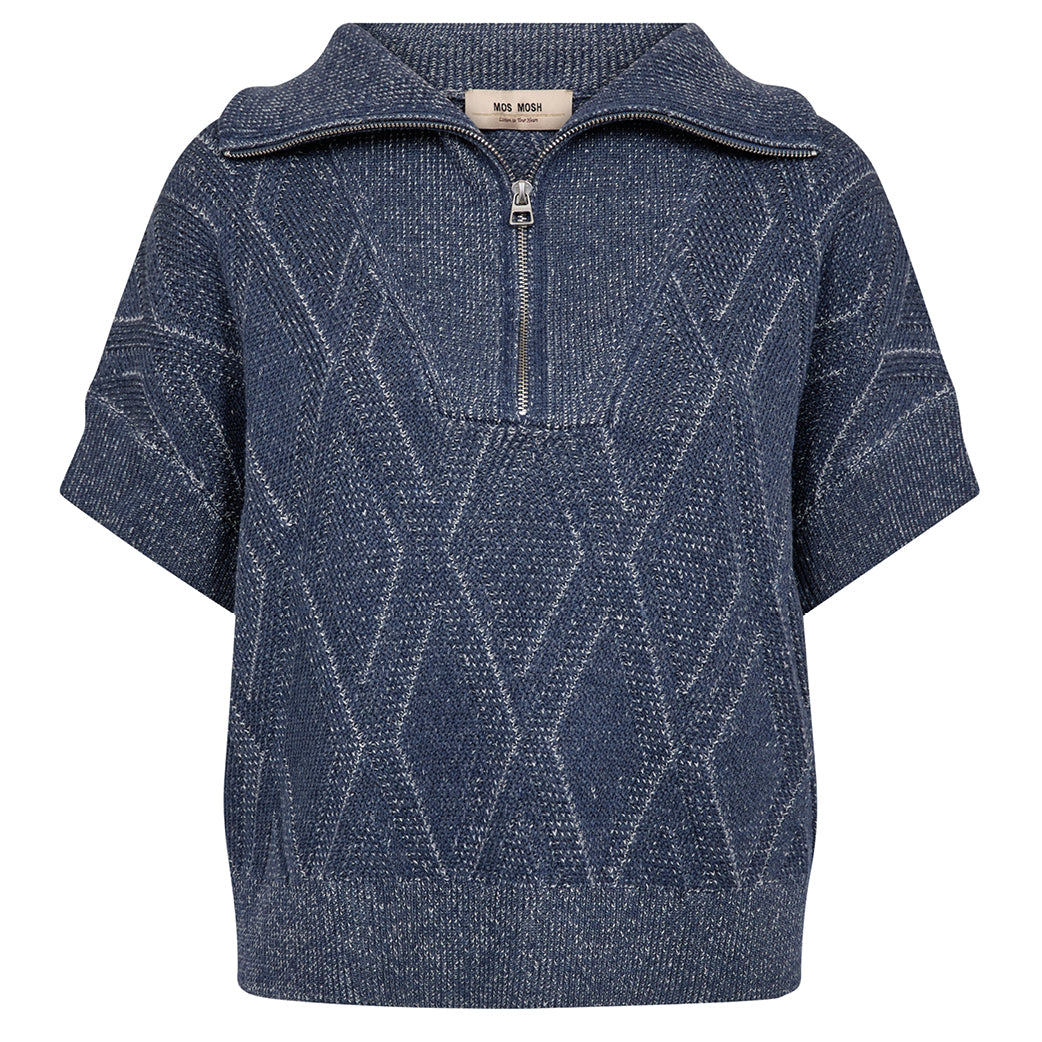Skøn strik med glimmer fra Mos Mosh med korte ærmer. Med lynlås ved udskæringen og ribkanter.