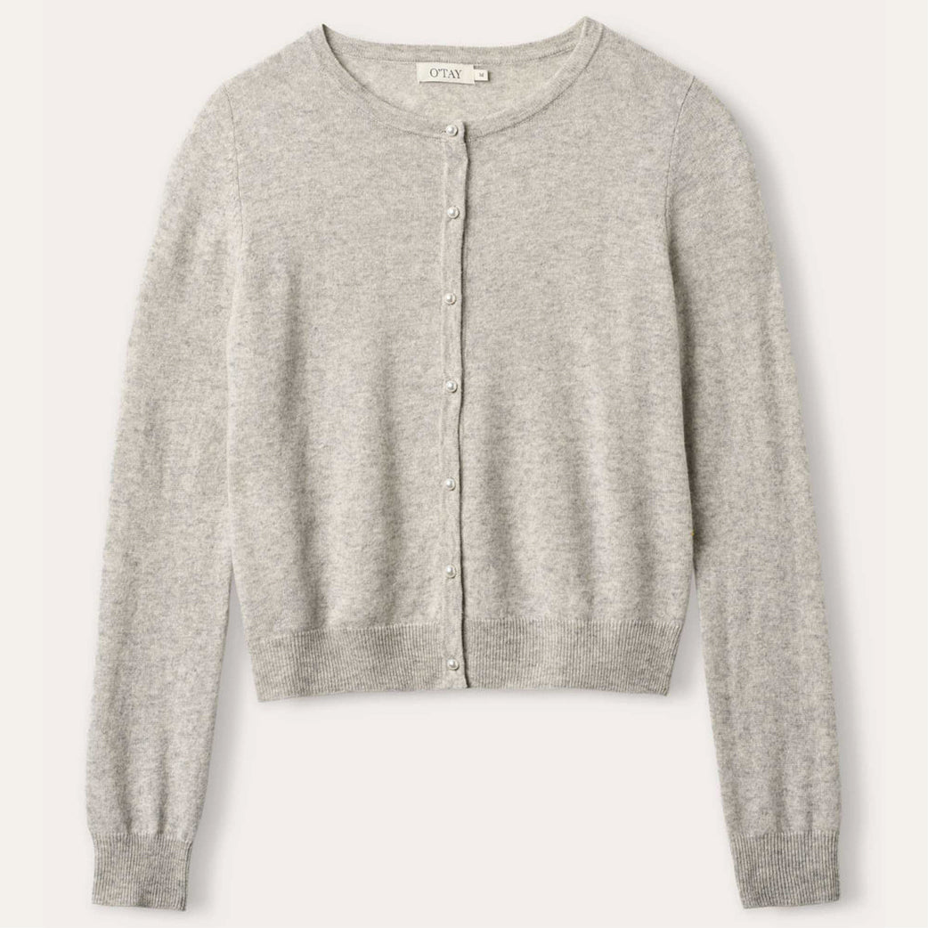 Skøn klassisk cardigan fra O'tay i cashmereblanding med fine små perleknapper. Med rund hals og ribkanter. Klassisk og tidløs.