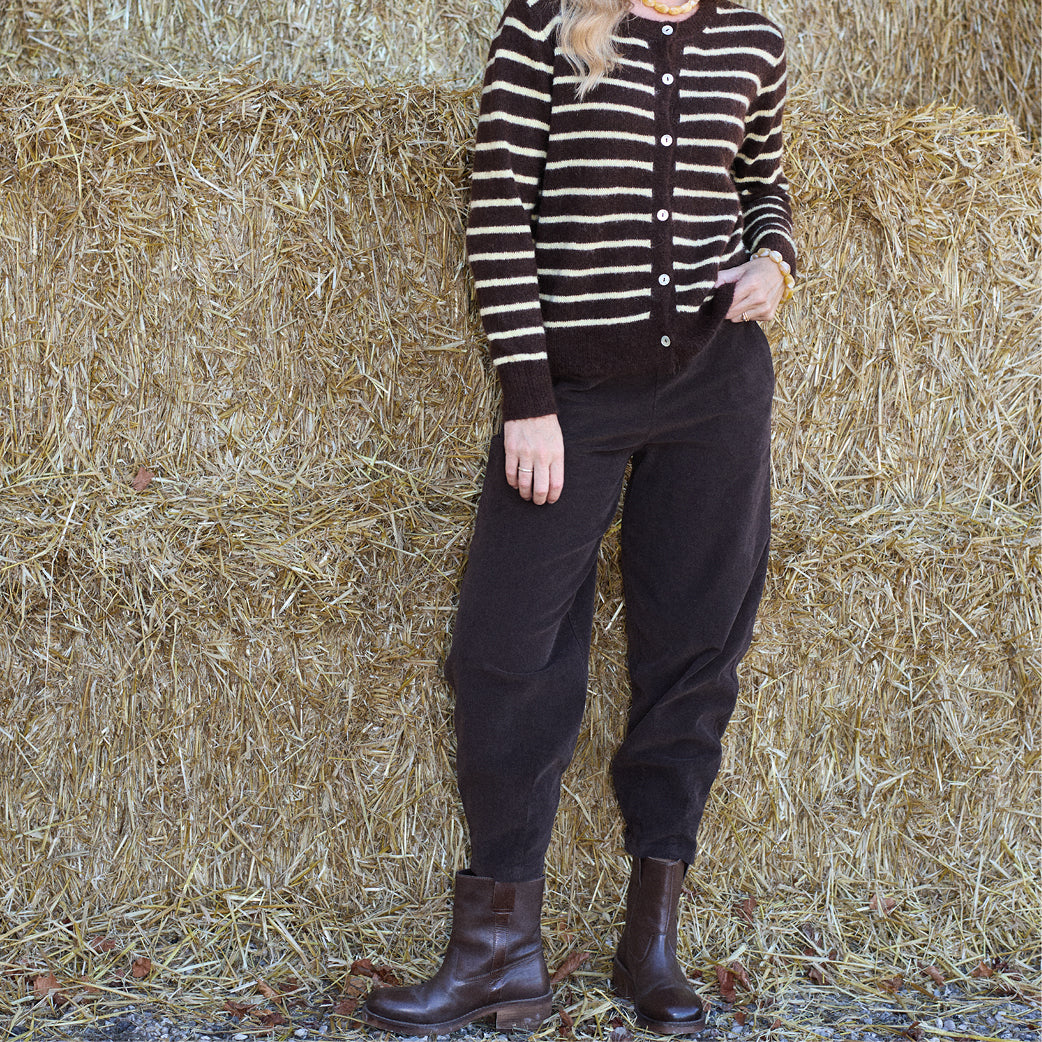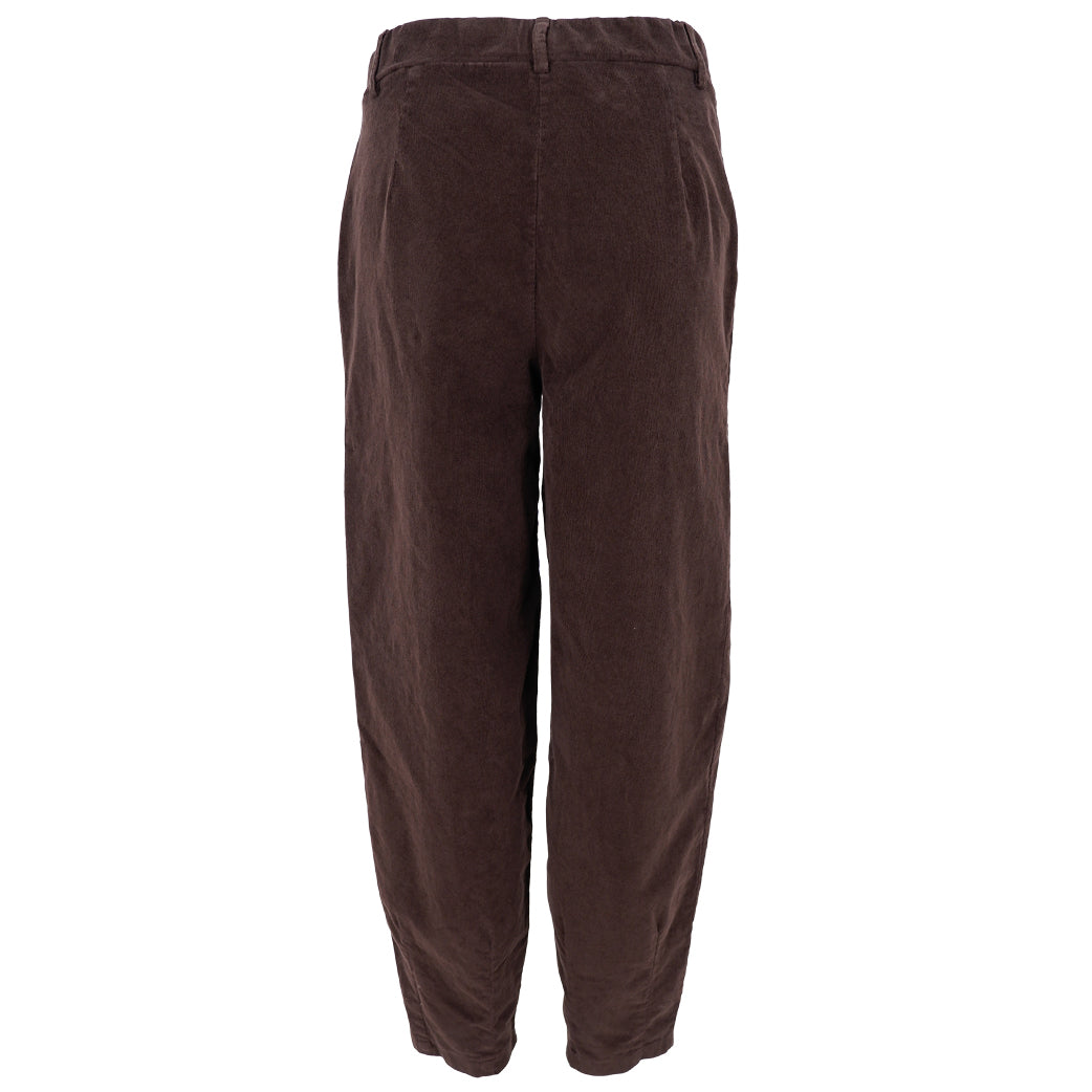 Flotte bukser fra Black Colour med barrel pasform. Lavet i blød fløjl. Med mellemhøj talje, bæltestropper og elastik i taljen bagpå.