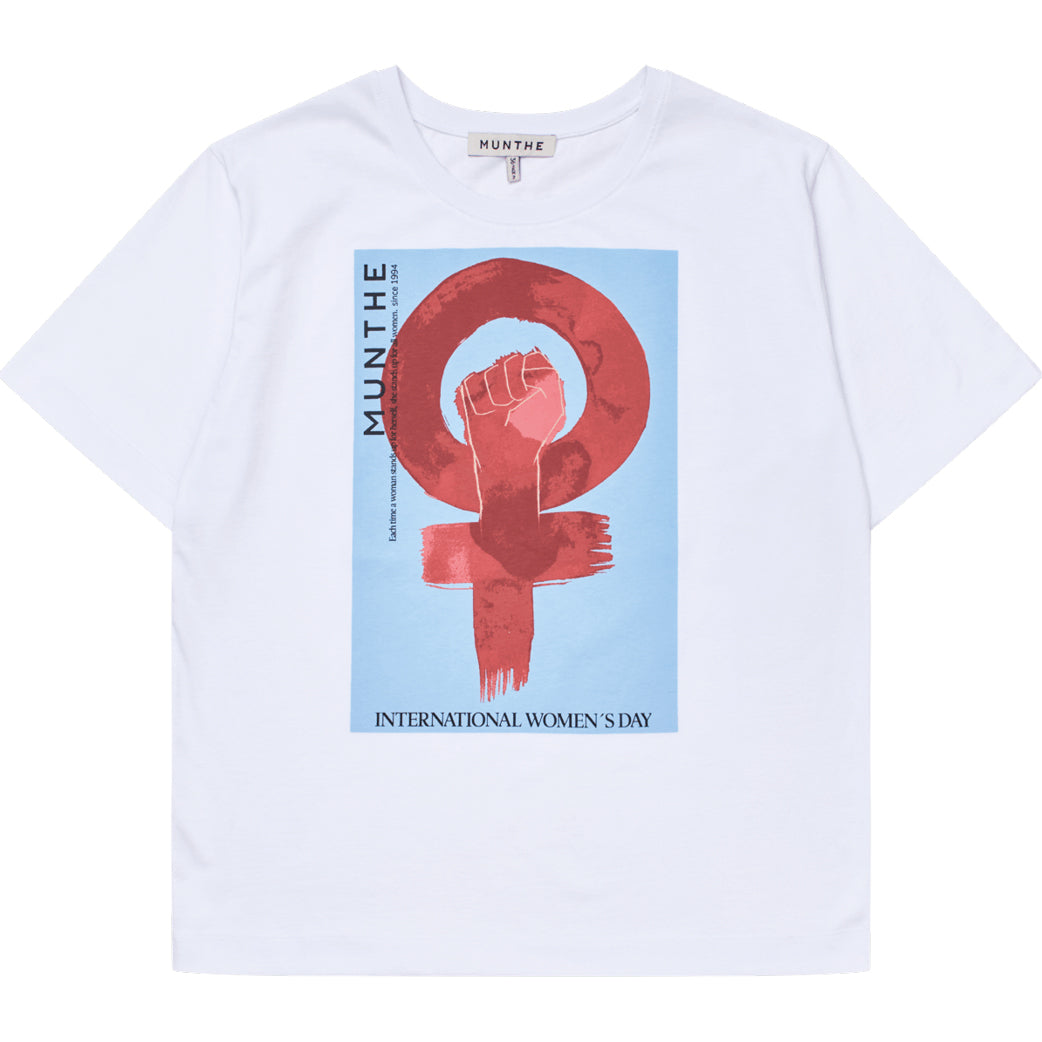 Cool hvid t-shirt fra Munthe. T-shirten har rund hals, korte ærmer og et fint grafisk print foran.