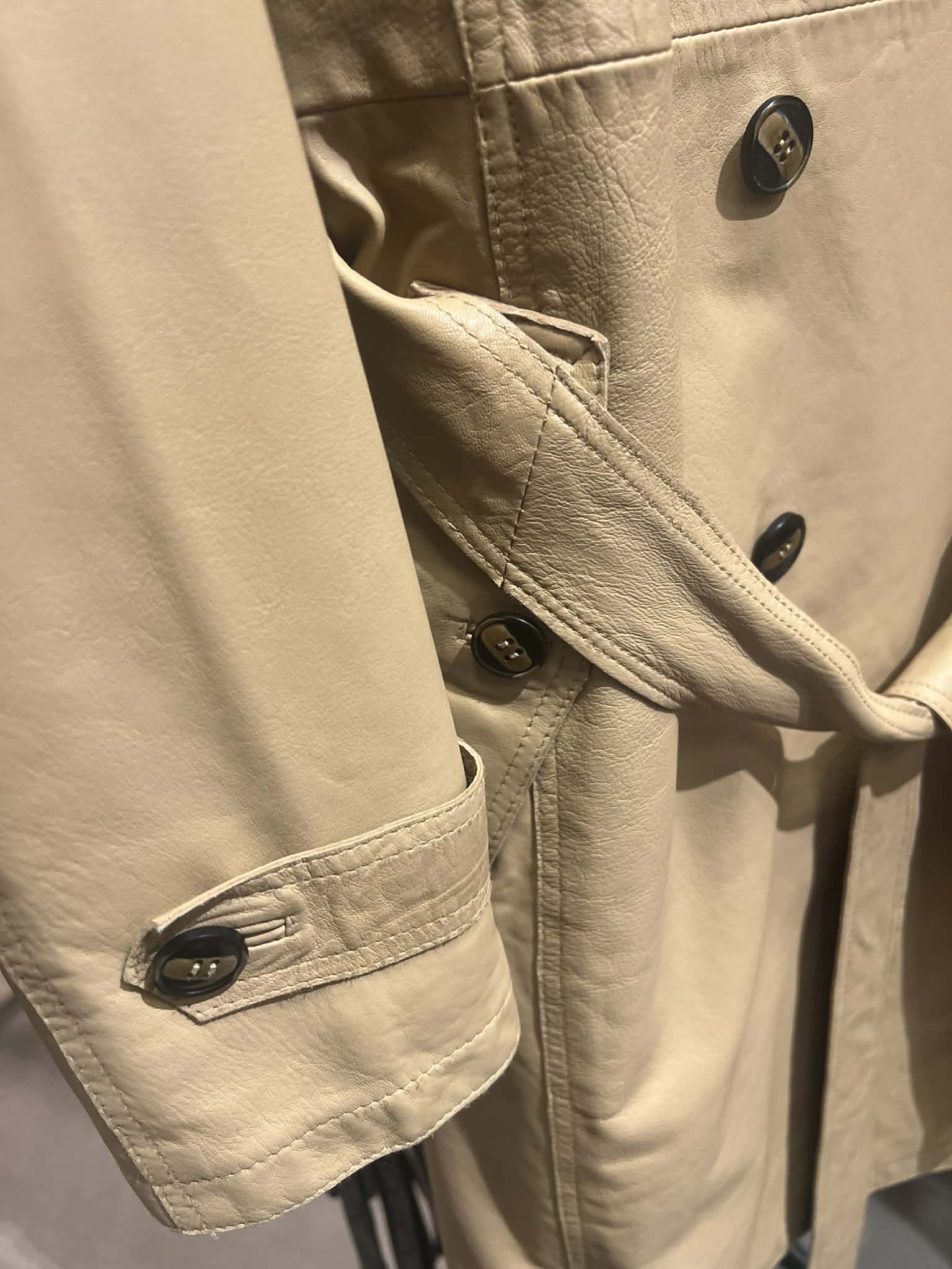 Flot lang trenchcoat fra Bft lavet i 100 % skind. Jakken er med åben krave og dobbeltradede knapper foran.