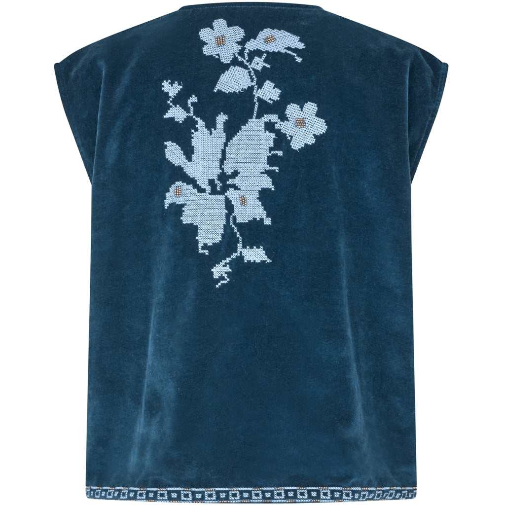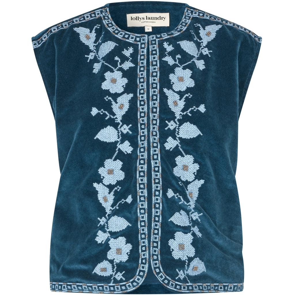 Smuk boheme-inspireret vest fra Lollys Laundry i flot blå farve med fine lyseblå broderinger både foran og bagpå.